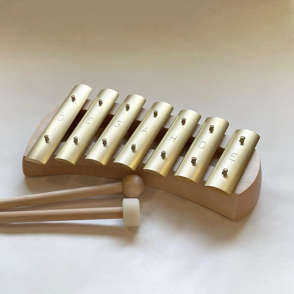 The tone bars consist of a brass alloy coated with beeswax to enhance and preserve their soft, natural shine. The resonating body is made of varnished maple, and is polished with beeswax.