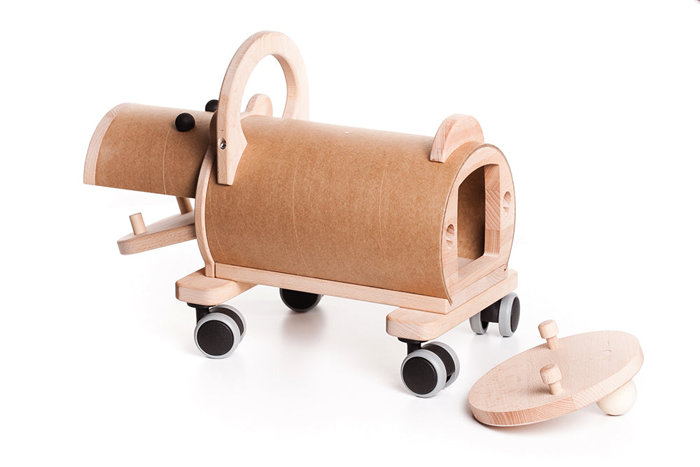 From Bajo: "By incorporating special thick cardboard tube in the design of these toys, we gave to some of them an empty space inside where children can easily deposit and retrieve their treasures, the animal becomes the guardian of the child’s special objects."
