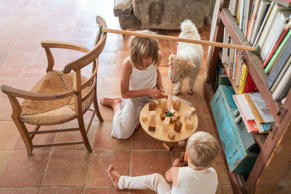 A balance board and a collection of wooden pieces. Challenge yourself to find the perfect balance, make it spin, or experiment with the concepts of physics—all with your own hands!
