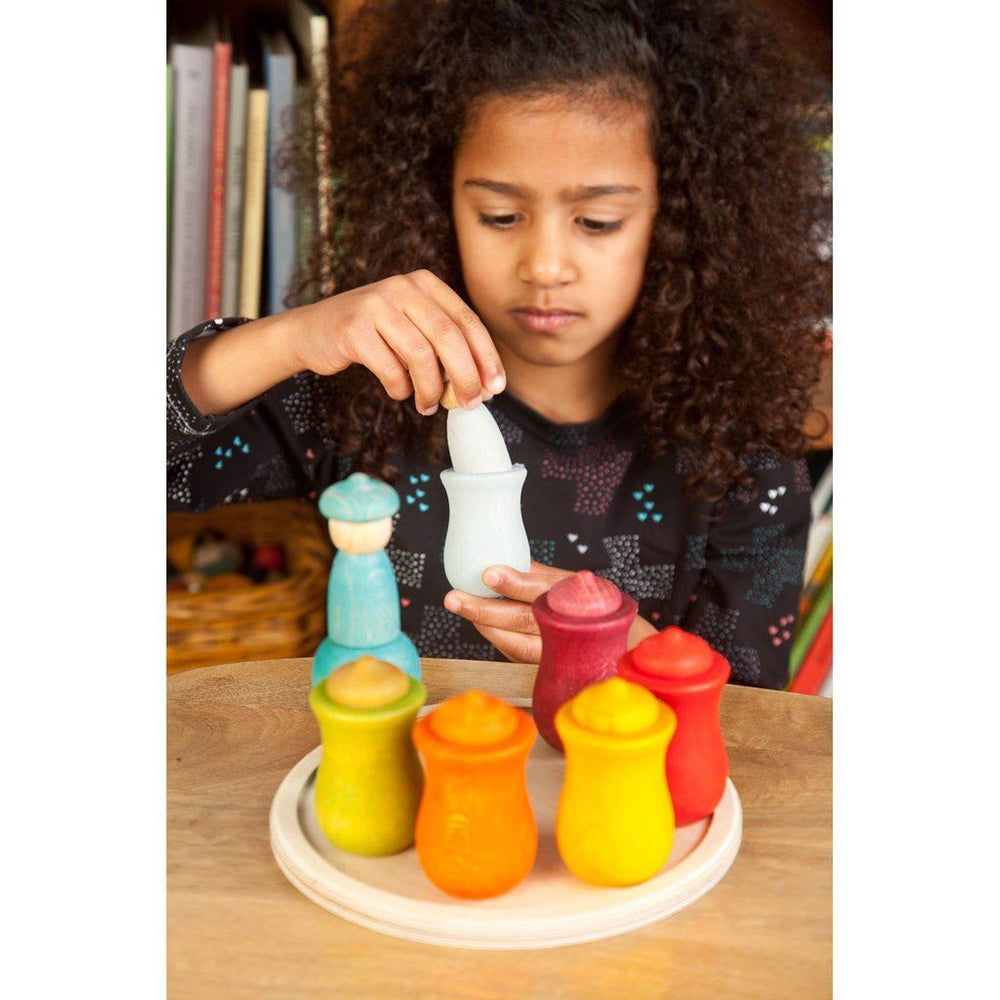 Contains 7 Nins (peg dolls) with acorn hats in 7 colours that are associated with each day of the week according to Waldorf pedagogy. 7 vessels and 1 round dish (18cm diameter) where the elements are contained.