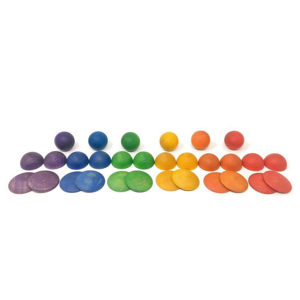 It contains: 12 discs in 6 colours,12 half spheres in 6 colours, 6 spheres in 6 colours.