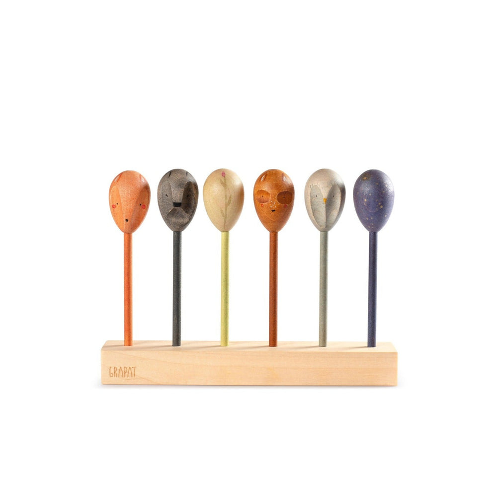 Grapat started to form as an idea after the birth of our first child, Lola. We realised how she didn’t really need any off-the-shelf toys in order to play and would use her ingeniousness to turn everyday objects into whatever she desired. Looking at how happy she was, we realised that being present, observing her needs and offering daily objects to fulfil them, was all that really mattered. After the birth of our second child Tomàs, we moved from the big city to the countryside. In the former home of Jordi’s family, we could integrate the slower way of life we had been longing for. We started to create and play with wood, and slowly but surely, the family home turned into a fully operational workshop. We would create the pieces with machinery installed in the barn where a donkey used to live years before and would stain them by hand with old sheets in kitchen where Jordi’s grandmother used to cook up delicious meals. This is when our dream, our own company, finally materialised. Grapat means “a handful” in Catalan, the native language of our land, and this is exactly where the simple idea behind this humble project came from: to carry a handful of loose pieces with the utmost care in our hands, and offer them with the same love to the hands of children.