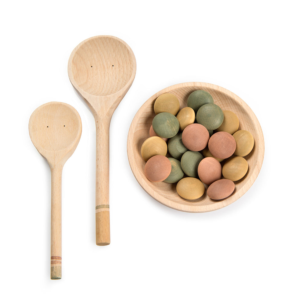 Yummy by Grapat includes:  1 plate 125 mm in diameter, 1 big spoon, 1 small spoon and 24 wooden pieces of 'food'.