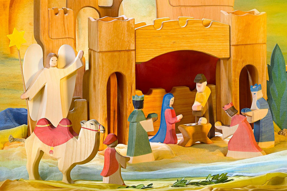 Ostheimer figures are made entirely by hand in Germany. The high quality of environmentally-friendly Ostheimer wooden toys is based on the use of certified materials. The warm, natural material of wood comes from sustainable domestic forestry and certified organic wood, and the selected childsafe colors and organic oils preserve the natural characteristics of the wood and make it tangible for the child. Many senses are thus involved: the grains of the surface of the wood, the smell of high-quality oils, the beautiful sight for the eye. Artistic and practical designing and painting have a focus so that the characteristic peculiarities of an animal's very typical appearance, in short its spirit, are expressed in it. This is so achieved, not in merely the naturalistic depiction that each outer detail creates, but rather the shapes and painting are deliberately limited to essentials; something special from the character and gesture of an animal or a human figure. The child is not getting something finished in the hand, not a detailed snapshot of a trotting horse with defined eyelashes and facial expression - rather, an Ostheimer wooden figure leaves the child completely immersed in the exciting world of "horse" and gives their imagination much space for play, again and again new scenes and situations to make: as the horse is galloping, standing, neighing, nestling their head against me or it lies down to rest. The design of Ostheimer figures can behave in typical fashion in their movement, as they can look at any moment quite different. All that is in the restrained design of the wooden figure in it, and the child can bring it out, imaginative play coming to life.