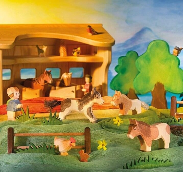 Ostheimer figures are made entirely by hand in Germany. The high quality of environmentally-friendly Ostheimer wooden toys is based on the use of certified materials. The warm, natural material of wood comes from sustainable domestic forestry and certified organic wood, and the selected childsafe colors and organic oils preserve the natural characteristics of the wood and make it tangible for the child. Many senses are thus involved: the grains of the surface of the wood, the smell of high-quality oils, the beautiful sight for the eye. Artistic and practical designing and painting have a focus so that the characteristic peculiarities of an animal's very typical appearance, in short its spirit, are expressed in it. This is so achieved, not in merely the naturalistic depiction that each outer detail creates, but rather the shapes and painting are deliberately limited to essentials; something special from the character and gesture of an animal or a human figure. The child is not getting something finished in the hand, not a detailed snapshot of a trotting horse with defined eyelashes and facial expression - rather, an Ostheimer wooden figure leaves the child completely immersed in the exciting world of "horse" and gives their imagination much space for play, again and again new scenes and situations to make: as the horse is galloping, standing, neighing, nestling their head against me or it lies down to rest. The design of Ostheimer figures can behave in typical fashion in their movement, as they can look at any moment quite different. All that is in the restrained design of the wooden figure in it, and the child can bring it out, imaginative play coming to life.