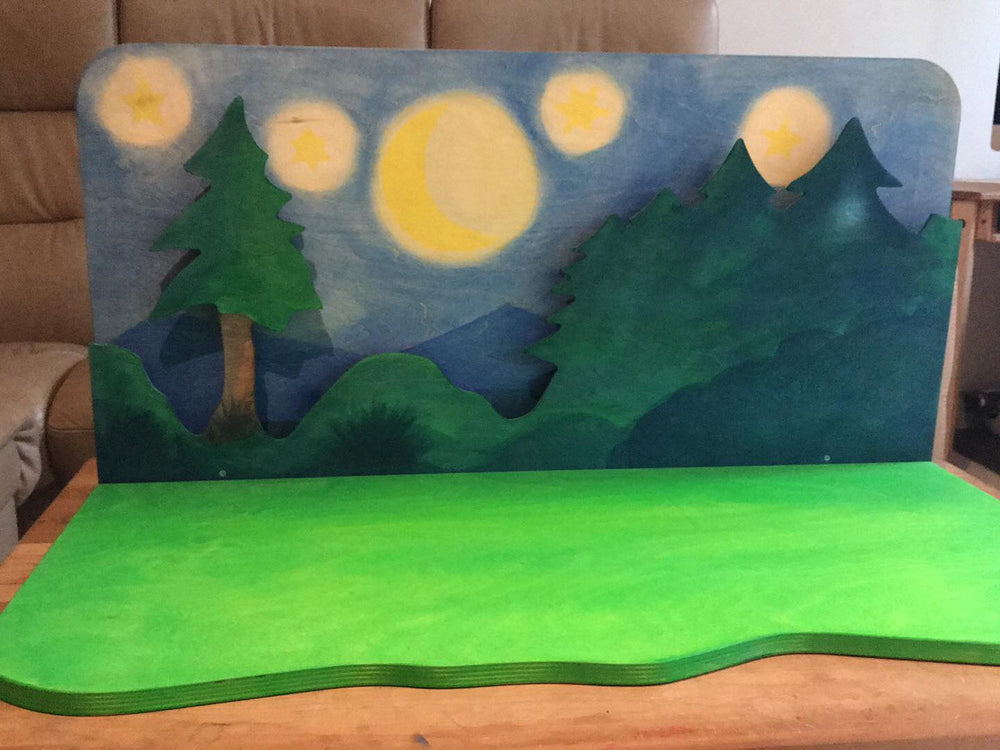 This particular background is reversible, with day on one side, and night on the other; please note that it also is 'multi-layer' with plywood trees. The trees however are very thin, and if pulled on, the plywood will snap. For children who might be curious to interact more with the display, the non-reversible background would be more recommended.