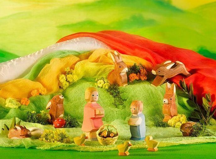 Ostheimer figures are made entirely by hand in Germany. The high quality of environmentally-friendly Ostheimer wooden toys is based on the use of certified materials. The warm, natural material of wood comes from sustainable domestic forestry and certified organic wood, and the selected childsafe colors and organic oils preserve the natural characteristics of the wood and make it tangible for the child. Many senses are thus involved: the grains of the surface of the wood, the smell of high-quality oils, the beautiful sight for the eye. Artistic and practical designing and painting have a focus so that the characteristic peculiarities of an animal's very typical appearance, in short its spirit, are expressed in it. This is so achieved, not in merely the naturalistic depiction that each outer detail creates, but rather the shapes and painting are deliberately limited to essentials; something special from the character and gesture of an animal or a human figure. The child is not getting something finished in the hand, not a detailed snapshot of a trotting horse with defined eyelashes and facial expression - rather, an Ostheimer wooden figure leaves the child completely immersed in the exciting world of "horse" and gives their imagination much space for play, again and again new scenes and situations to make: as the horse is galloping, standing, neighing, nestling their head against me or it lies down to rest. The design of Ostheimer figures can behave in typical fashion in their movement, as they can look at any moment quite different. All that is in the restrained design of the wooden figure in it, and the child can bring it out, imaginative play coming to life.