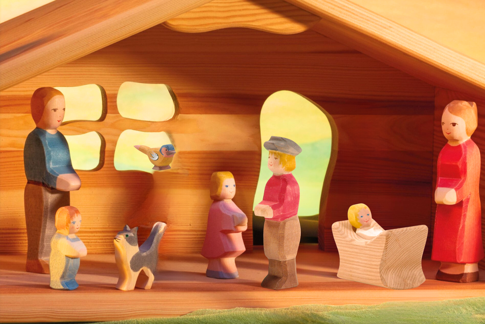 Ostheimer figures are made entirely by hand in Germany. The high quality of environmentally-friendly Ostheimer wooden toys is based on the use of certified materials. The warm, natural material of wood comes from sustainable domestic forestry and certified organic wood, and the selected childsafe colors and organic oils preserve the natural characteristics of the wood and make it tangible for the child. Many senses are thus involved: the grains of the surface of the wood, the smell of high-quality oils, the beautiful sight for the eye. Artistic and practical designing and painting have a focus so that the characteristic peculiarities of an animal's very typical appearance, in short its spirit, are expressed in it. This is so achieved, not in merely the naturalistic depiction that each outer detail creates, but rather the shapes and painting are deliberately limited to essentials; something special from the character and gesture of an animal or a human figure. The child is not getting something finished in the hand, not a detailed snapshot of a trotting horse with defined eyelashes and facial expression - rather, an Ostheimer wooden figure leaves the child completely immersed in the exciting world of "horse" and gives their imagination much space for play, again and again new scenes and situations to make: as the horse is galloping, standing, neighing, nestling their head against me or it lies down to rest. The design of Ostheimer figures can behave in typical fashion in their movement, as they can look at any moment quite different. All that is in the restrained design of the wooden figure in it, and the child can bring it out, imaginative play coming to life.