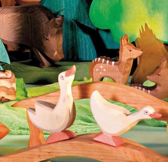 Ostheimer figures are made entirely by hand in Germany. The high quality of environmentally-friendly Ostheimer wooden toys is based on the use of certified materials. The warm, natural material of wood comes from sustainable domestic forestry and certified organic wood, and the selected childsafe colors and organic oils preserve the natural characteristics of the wood and make it tangible for the child. Many senses are thus involved: the grains of the surface of the wood, the smell of high-quality oils, the beautiful sight for the eye. Artistic and practical designing and painting have a focus so that the characteristic peculiarities of an animal's very typical appearance, in short its spirit, are expressed in it. This is so achieved, not in merely the naturalistic depiction that each outer detail creates, but rather the shapes and painting are deliberately limited to essentials; something special from the character and gesture of an animal or a human figure. The child is not getting something finished in the hand, not a detailed snapshot of a trotting horse with defined eyelashes and facial expression - rather, an Ostheimer wooden figure leaves the child completely immersed in the exciting world of "horse" and gives their imagination much space for play, again and again new scenes and situations to make: as the horse is galloping, standing, neighing, nestling their head against me or it lies down to rest. The design of Ostheimer figures can behave in typical fashion in their movement, as they can look at any moment quite different. All that is in the restrained design of the wooden figure in it, and the child can bring it out, imaginative play coming to life.