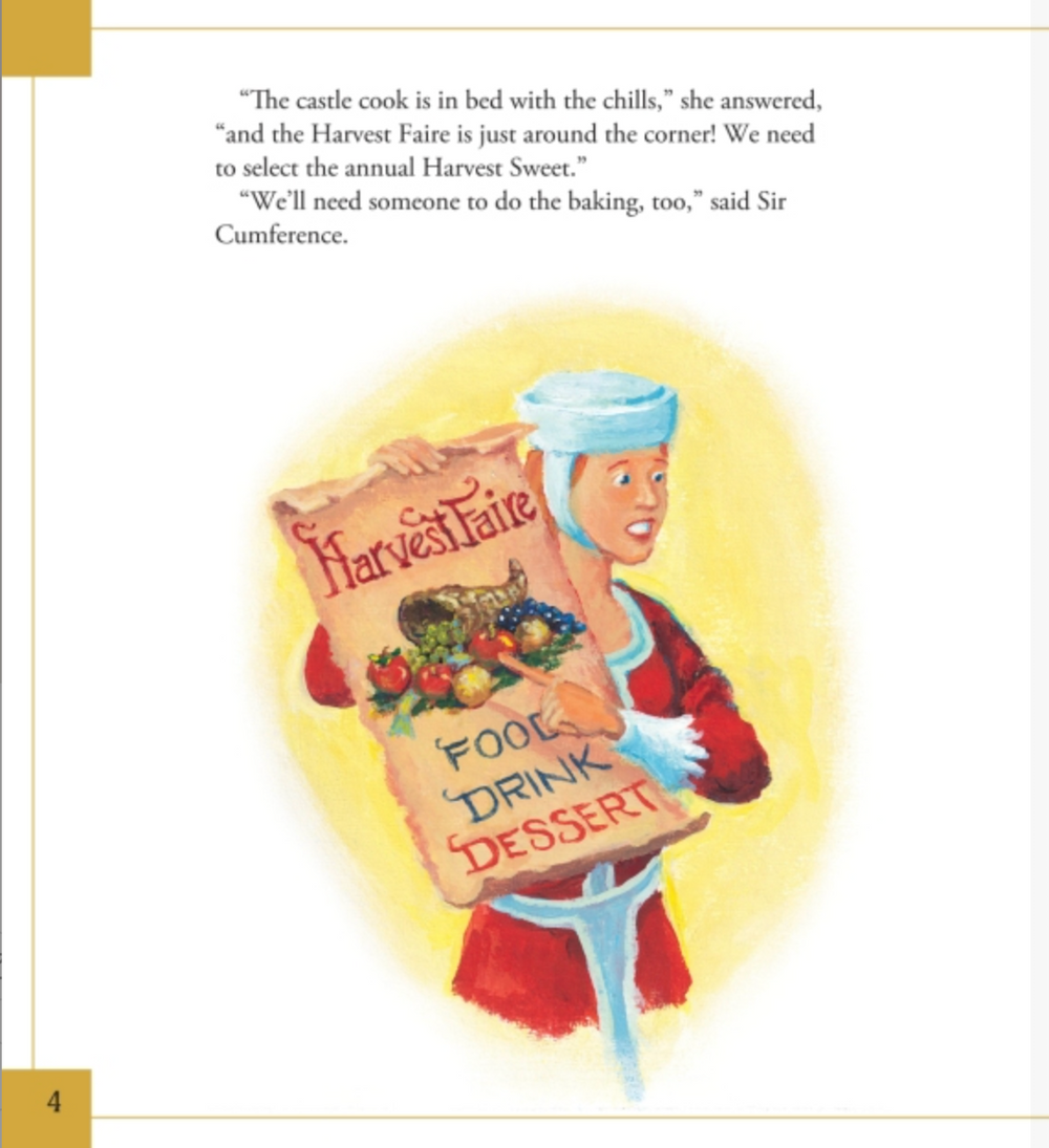"Sir Cumference and the Off-the-Charts Dessert is one of eight books in Neuschwander’s series of mathematical adventures. This time, the medieval-style characters are embroiled in a bake-off of statistical proportions to determine this year’s Harvest Treat for the upcoming Harvest Faire. Pia from Chartres offers the best pies in town, and Bart Graf makes an assortment of cookies, but how to determine a winner? Ultimately, the pie graph and bar graph that are constructed, showing favorites among the pies and cookies respectively, make the selection obvious. Geared for grades 4–6, most of Neuschwander’s previous books help introduce and reinforce geometry concepts. In this book, she does the same for data analysis. Filled with delicious puns, the text is engaging and accurate; Geehan’s detailed illustrations enhance the mathematical information presented and promote a sense of fun. Fourth graders will think they themselves are unlocking the secret to the puns of “Pia from Chartres” and “Lady Di of Ameter,” whereas older students will simply groan. In either case, the mathematical concepts will most likely be remembered." ~ Teaching Children Mathematics, NCTM