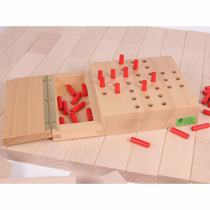Beech wood, varnished. With 33 holes and 32 red wooden pegs (plus 3 additional spare pegs). For peg storage and deposit during the game, there is a hinged lid with a compartment at the side. Instructions included.