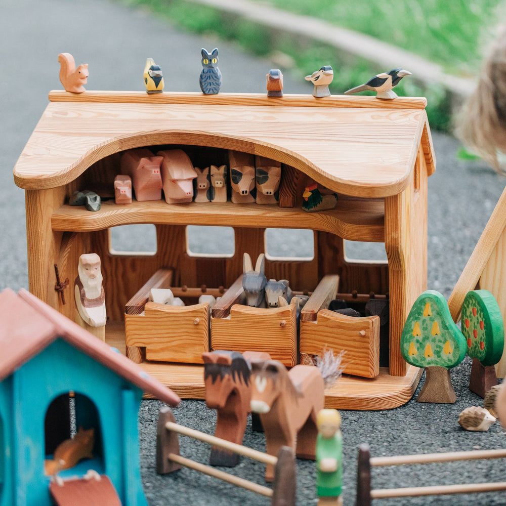 Ostheimer figures are made entirely by hand in Germany. The high quality of environmentally-friendly Ostheimer wooden toys is based on the use of certified materials. The warm, natural material of wood comes from sustainable domestic forestry and certified organic wood, and the selected childsafe colors and organic oils preserve the natural characteristics of the wood and make it tangible for the child. Many senses are thus involved: the grains of the surface of the wood, the smell of high-quality oils, the beautiful sight for the eye. Artistic and practical designing and painting have a focus so that the characteristic peculiarities of an animal's very typical appearance, in short its spirit, are expressed in it. This is so achieved, not in merely the naturalistic depiction that each outer detail creates, but rather the shapes and painting are deliberately limited to essentials; something special from the character and gesture of an animal or a human figure. The child is not getting something finished in the hand, not a detailed snapshot of a trotting horse with defined eyelashes and facial expression - rather, an Ostheimer wooden figure leaves the child completely immersed in the exciting world of "horse" and gives their imagination much space for play, again and again new scenes and situations to make: as the horse is galloping, standing, neighing, nestling their head against me or it lies down to rest. The design of Ostheimer figures can behave in typical fashion in their movement, as they can look at any moment quite different. All that is in the restrained design of the wooden figure in it, and the child can bring it out, imaginative play coming to life.