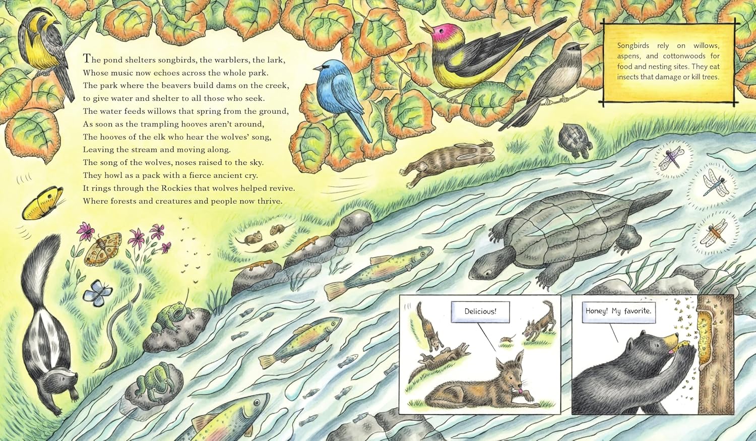 “Working in prose, rhyming verse, panel-style art, and sweeping spreads, Parry and Thermes tell the absorbing story of what happened when wolf packs were reintroduced into Yellowstone Park. . . . This rare work about successful environmental regeneration reveals how the reintroduction of a predator can rebalance a habitat.” - Publishers Weekly