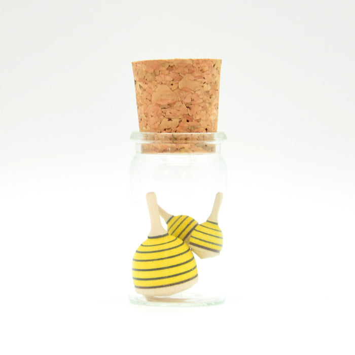 Bee swarm in a glass consists of 3 tops: 1 mini top bee and 2 miniature tops bees, all in bee design, glass diameter 28 mm, top bee: diameter approx. 20 mm - height approx. 35 mm, top bee: diameter approx. 10 mm - height approx. 20 mm, turned from local wood and hand-painted with water-based paints.