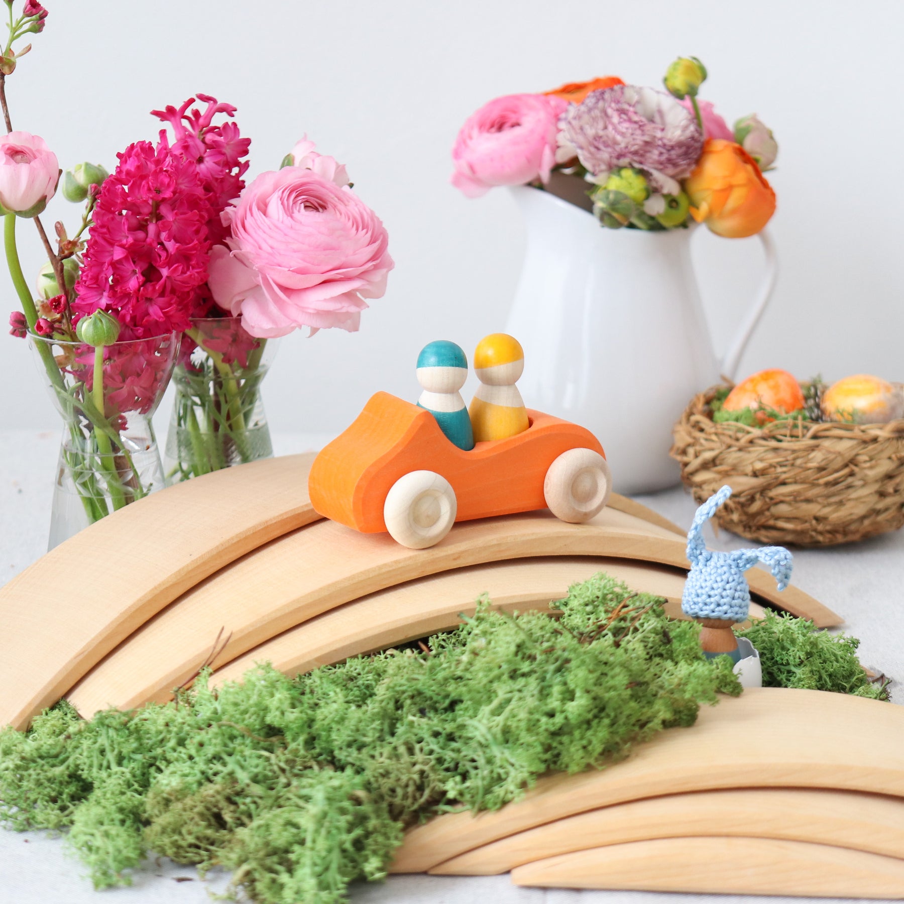 The Grimm's bridge is wonderful for playing with wooden trains, cars, etc. The stacking bridge is really versatile and ideal already for small children! Toddlers stack, sort and build and as the children get older they might use it as a cradle for dolls, as fence for animals, like a tunnel or bridge for vehicles, as house for dwarfs and dollhouse dolls, build amazing sculptures... this bridge will always be integrated in playing with a lot of fantasy.