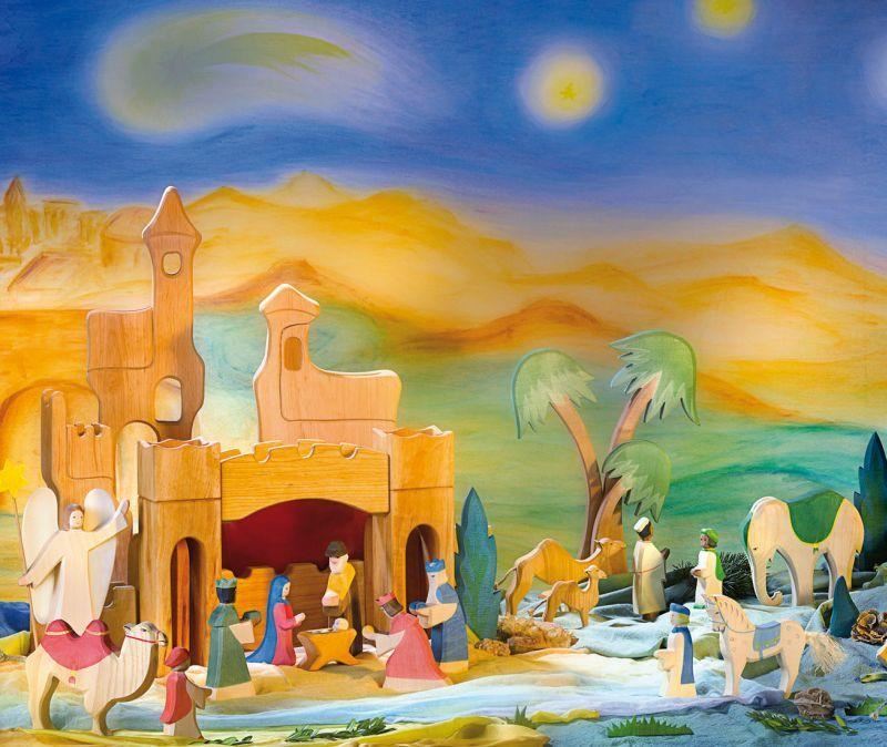 Ostheimer figures are made entirely by hand in Germany. The high quality of environmentally-friendly Ostheimer wooden toys is based on the use of certified materials. The warm, natural material of wood comes from sustainable domestic forestry and certified organic wood, and the selected childsafe colors and organic oils preserve the natural characteristics of the wood and make it tangible for the child. Many senses are thus involved: the grains of the surface of the wood, the smell of high-quality oils, the beautiful sight for the eye. Artistic and practical designing and painting have a focus so that the characteristic peculiarities of an animal's very typical appearance, in short its spirit, are expressed in it. This is so achieved, not in merely the naturalistic depiction that each outer detail creates, but rather the shapes and painting are deliberately limited to essentials; something special from the character and gesture of an animal or a human figure. The child is not getting something finished in the hand, not a detailed snapshot of a trotting horse with defined eyelashes and facial expression - rather, an Ostheimer wooden figure leaves the child completely immersed in the exciting world of "horse" and gives their imagination much space for play, again and again new scenes and situations to make: as the horse is galloping, standing, neighing, nestling their head against me or it lies down to rest. The design of Ostheimer figures can behave in typical fashion in their movement, as they can look at any moment quite different. All that is in the restrained design of the wooden figure in it, and the child can bring it out, imaginative play coming to life.