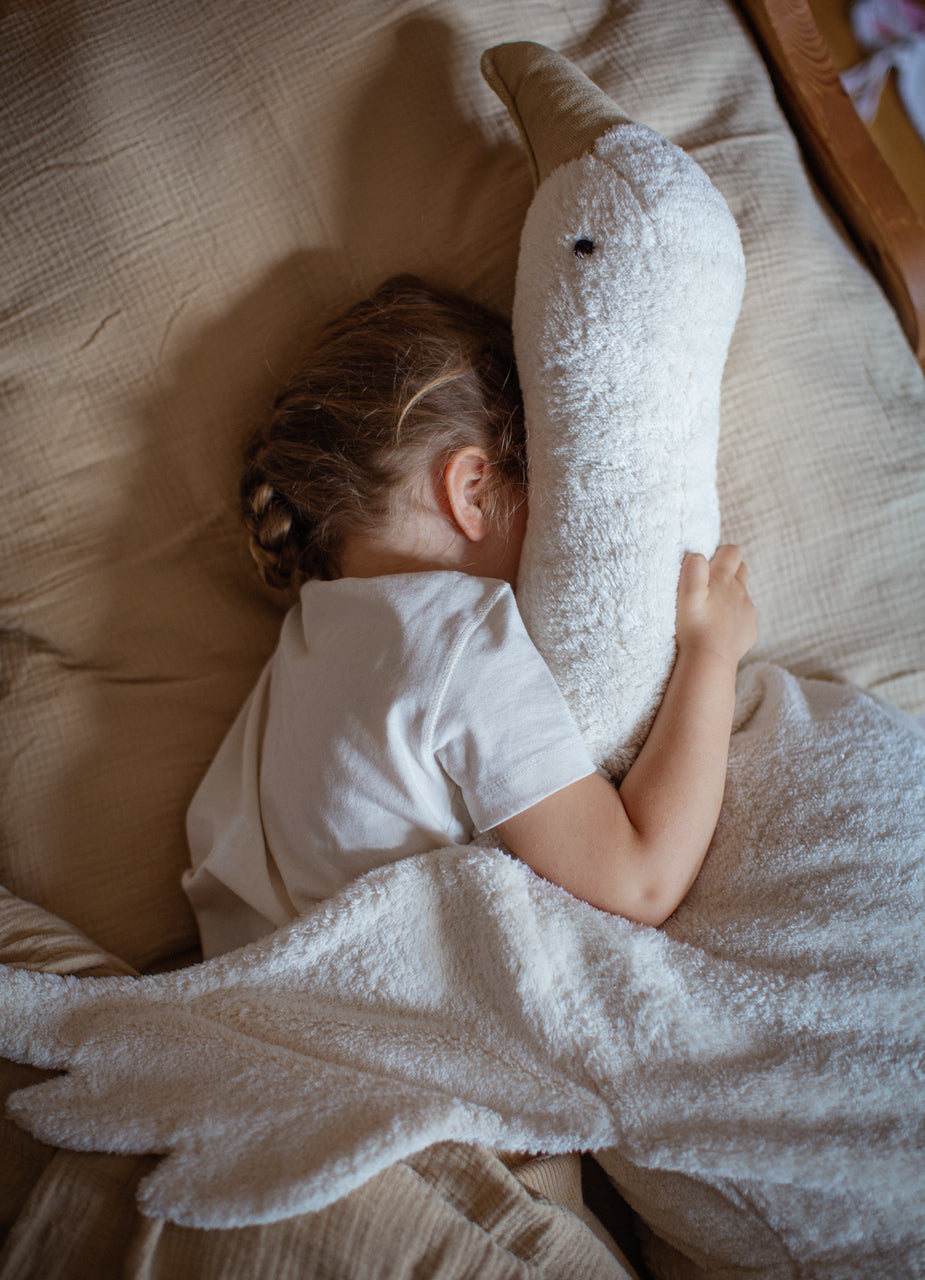 Our XL White Goose is a gentle presence with sculptural charm and timeless appeal. Lovingly made from GOTS-certified organic cotton and filled with pure sheep’s wool and a spelt husk pillow, it offers natural warmth and soft support. Whether as a floor cushion, an extra-large cuddle friend, or a calming accent in any room — it brings comfort, beauty, and quiet joy to everyday life.