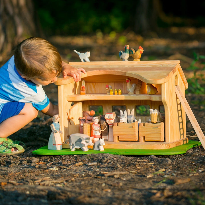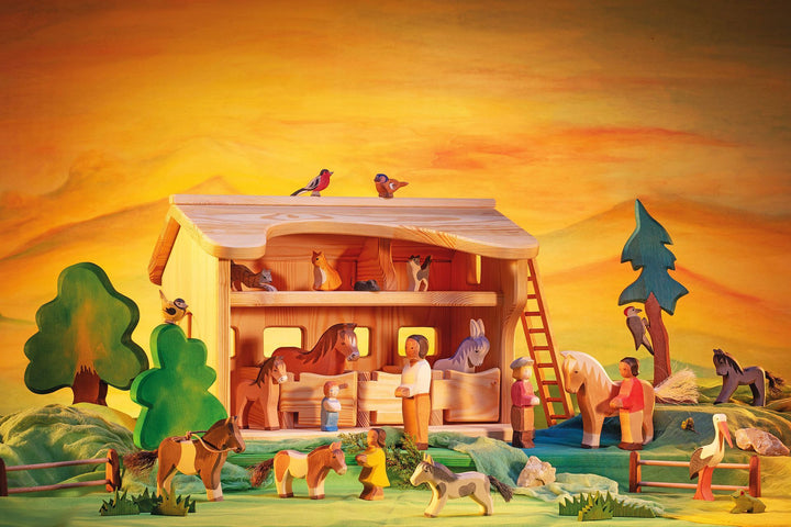 Ostheimer figures are made entirely by hand in Germany. The high quality of environmentally-friendly Ostheimer wooden toys is based on the use of certified materials. The warm, natural material of wood comes from sustainable domestic forestry and certified organic wood, and the selected childsafe colors and organic oils preserve the natural characteristics of the wood and make it tangible for the child. Many senses are thus involved: the grains of the surface of the wood, the smell of high-quality oils, the beautiful sight for the eye. Artistic and practical designing and painting have a focus so that the characteristic peculiarities of an animal's very typical appearance, in short its spirit, are expressed in it. This is so achieved, not in merely the naturalistic depiction that each outer detail creates, but rather the shapes and painting are deliberately limited to essentials; something special from the character and gesture of an animal or a human figure. The child is not getting something finished in the hand, not a detailed snapshot of a trotting horse with defined eyelashes and facial expression - rather, an Ostheimer wooden figure leaves the child completely immersed in the exciting world of "horse" and gives their imagination much space for play, again and again new scenes and situations to make: as the horse is galloping, standing, neighing, nestling their head against me or it lies down to rest. The design of Ostheimer figures can behave in typical fashion in their movement, as they can look at any moment quite different. All that is in the restrained design of the wooden figure in it, and the child can bring it out, imaginative play coming to life.