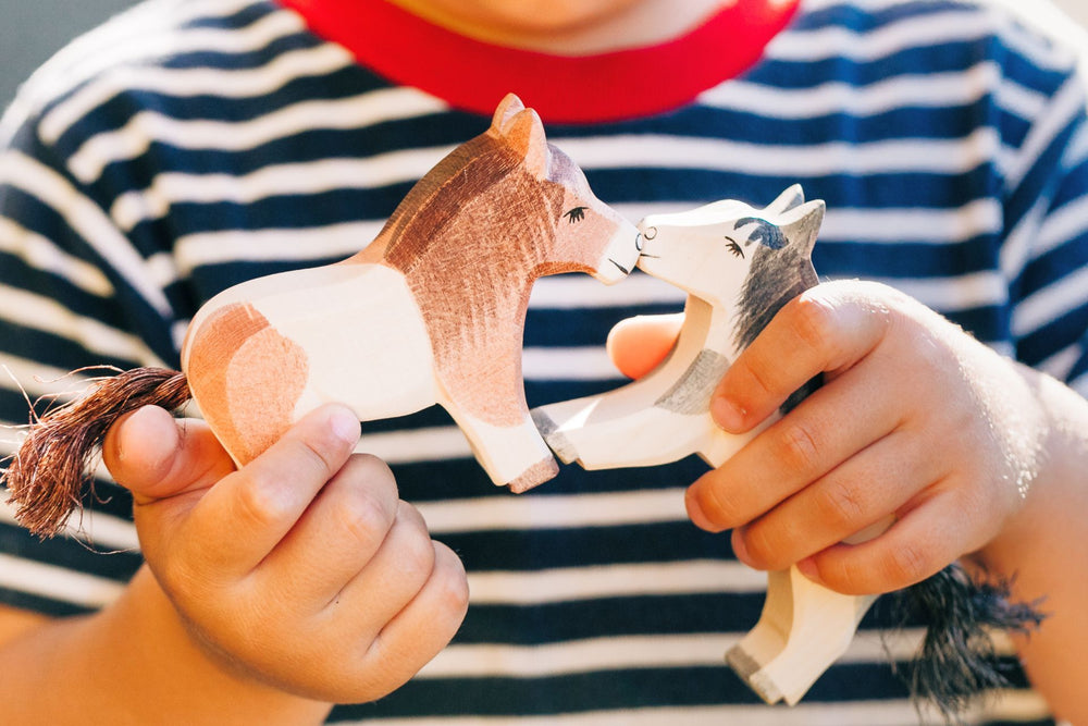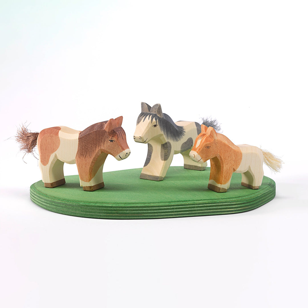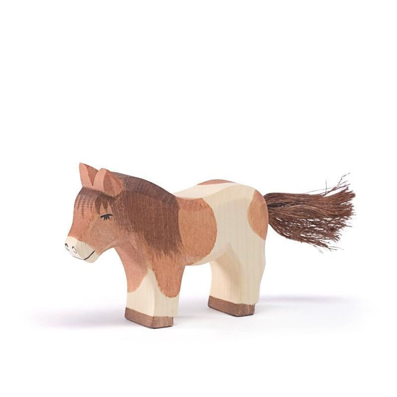 Ostheimer figures are made entirely by hand in Germany. The high quality of environmentally-friendly Ostheimer wooden toys is based on the use of certified materials. The warm, natural material of wood comes from sustainable domestic forestry and certified organic wood, and the selected childsafe colors and organic oils preserve the natural characteristics of the wood and make it tangible for the child. Many senses are thus involved: the grains of the surface of the wood, the smell of high-quality oils, the beautiful sight for the eye. Artistic and practical designing and painting have a focus so that the characteristic peculiarities of an animal's very typical appearance, in short its spirit, are expressed in it. This is so achieved, not in merely the naturalistic depiction that each outer detail creates, but rather the shapes and painting are deliberately limited to essentials; something special from the character and gesture of an animal or a human figure. The child is not getting something finished in the hand, not a detailed snapshot of a trotting horse with defined eyelashes and facial expression - rather, an Ostheimer wooden figure leaves the child completely immersed in the exciting world of "horse" and gives their imagination much space for play, again and again new scenes and situations to make: as the horse is galloping, standing, neighing, nestling their head against me or it lies down to rest. The design of Ostheimer figures can behave in typical fashion in their movement, as they can look at any moment quite different. All that is in the restrained design of the wooden figure in it, and the child can bring it out, imaginative play coming to life.