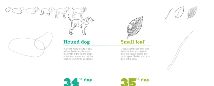 There is a step-by-step drawing exercise for every day of the year. Each shows the steps from the first line to the last and a brief text explains the steps. You can move through the book front to back or pick and choose. All 365 drawings start with one shape or line -- a circle, an oval, a square, a rectangle, a curved line, a straight line -- upon which the object or person is built. By mixing these basic strokes anything is achievable.