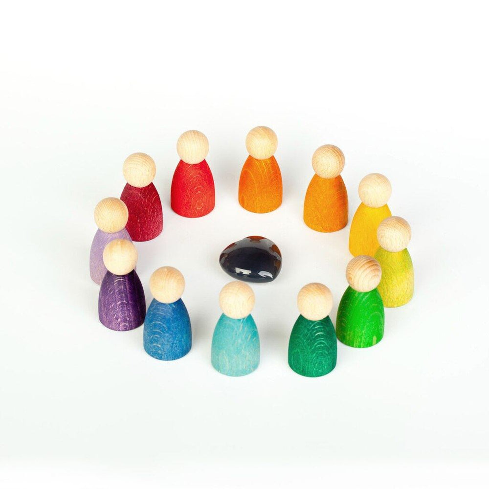 The 12 Nins become a toy which can be used in symbolic play, to create stories and small worlds. However, combined with other elements, they can be part of mathematical, language and sensorial games, among others. Moreover, this material is not structured, which allows for it to be used in a broad number of ways. They don’t have eyes, or a gender. This way, it’s the children who can develop their own stories and it’s them who decide which character they are going to play with.