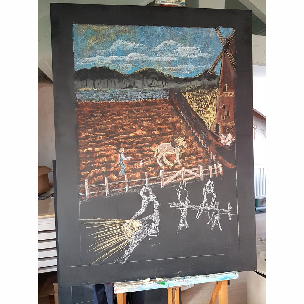 There is something magical about a chalkboard drawing.  Because of the black background, you not only apply color when you start drawing, but also light.  Chalk as a material is vulnerable but also very flexible, you can make quick impressions with it, but you can also work with it in detail.  The board drawings are transient, and eventually become again.  However, this also creates space for a new drawing.