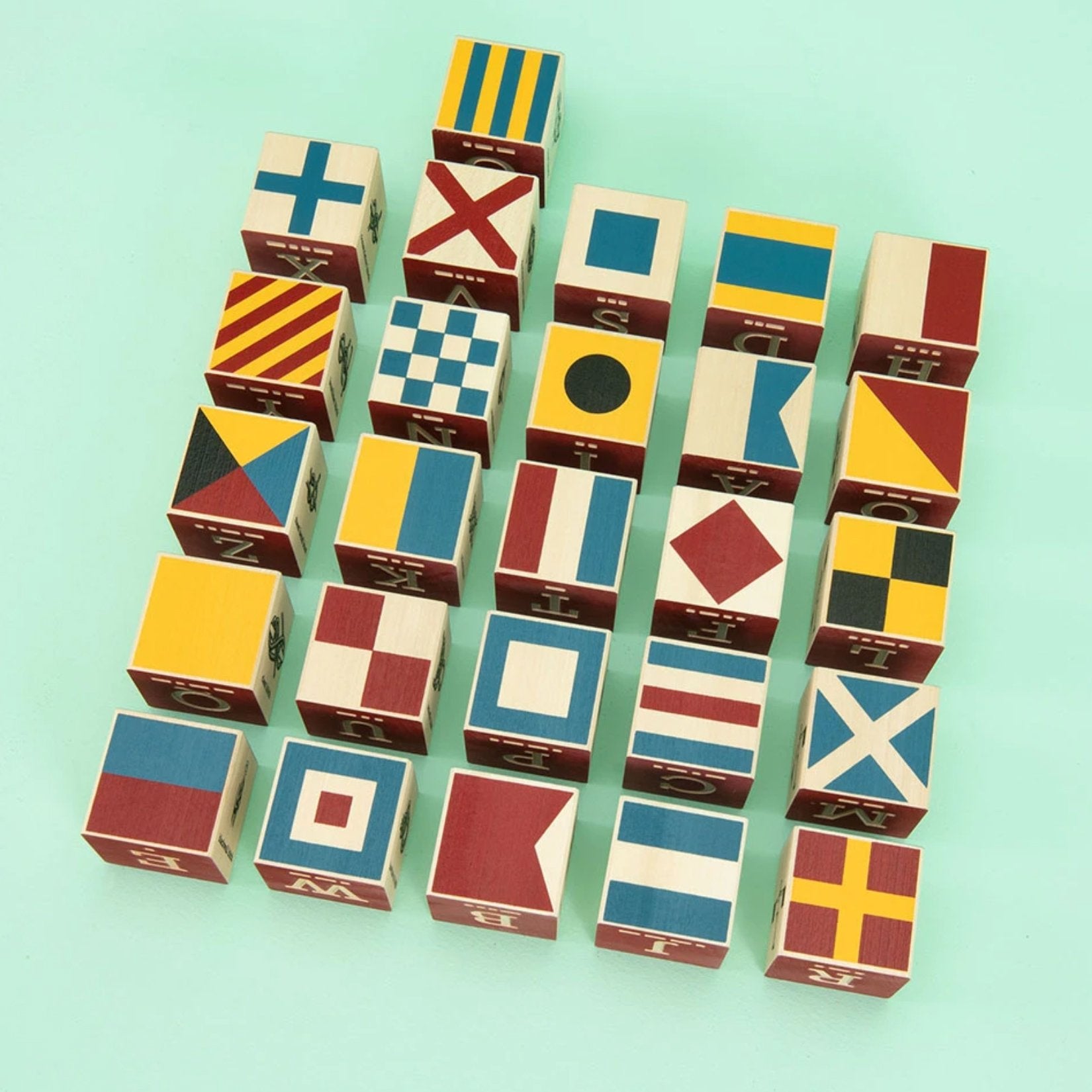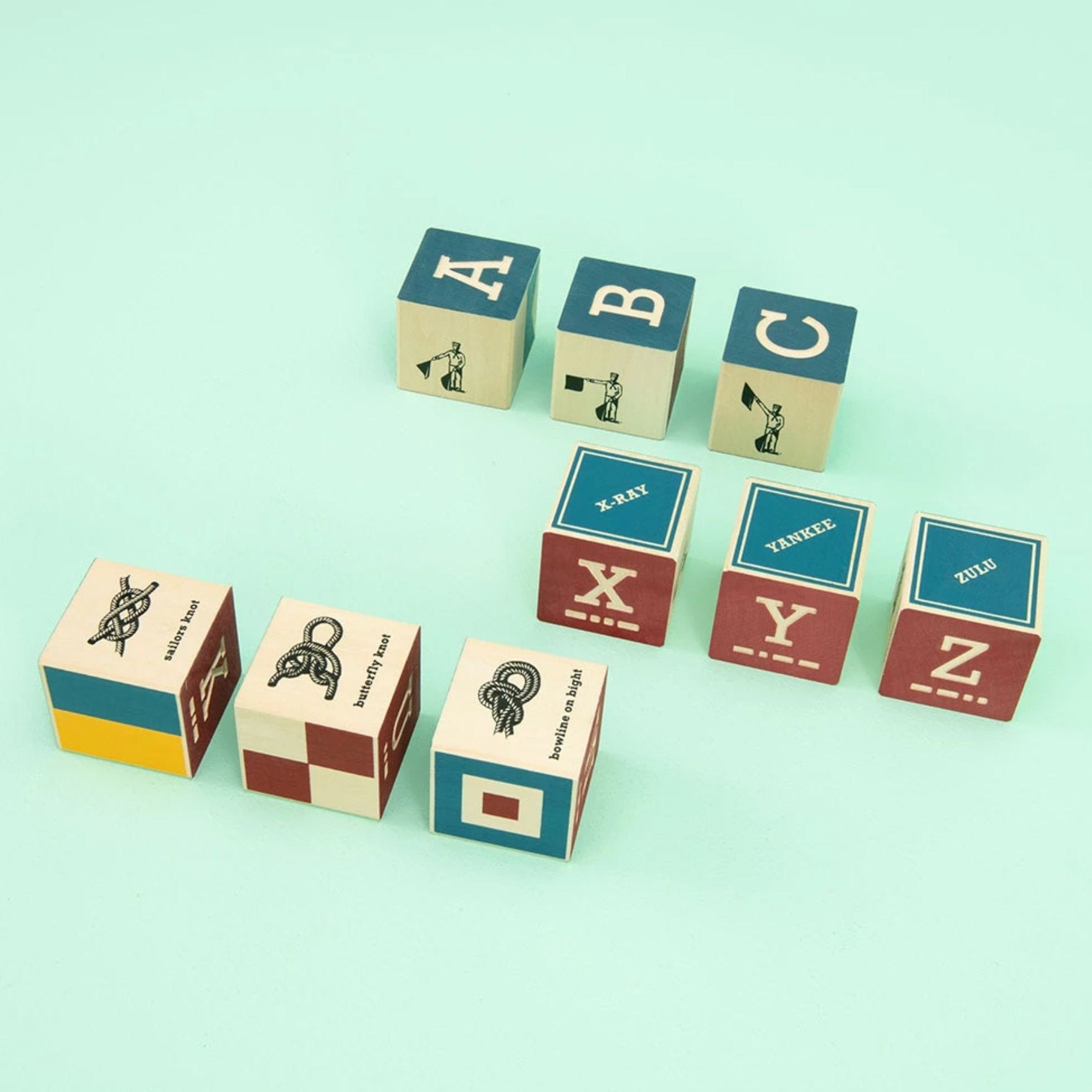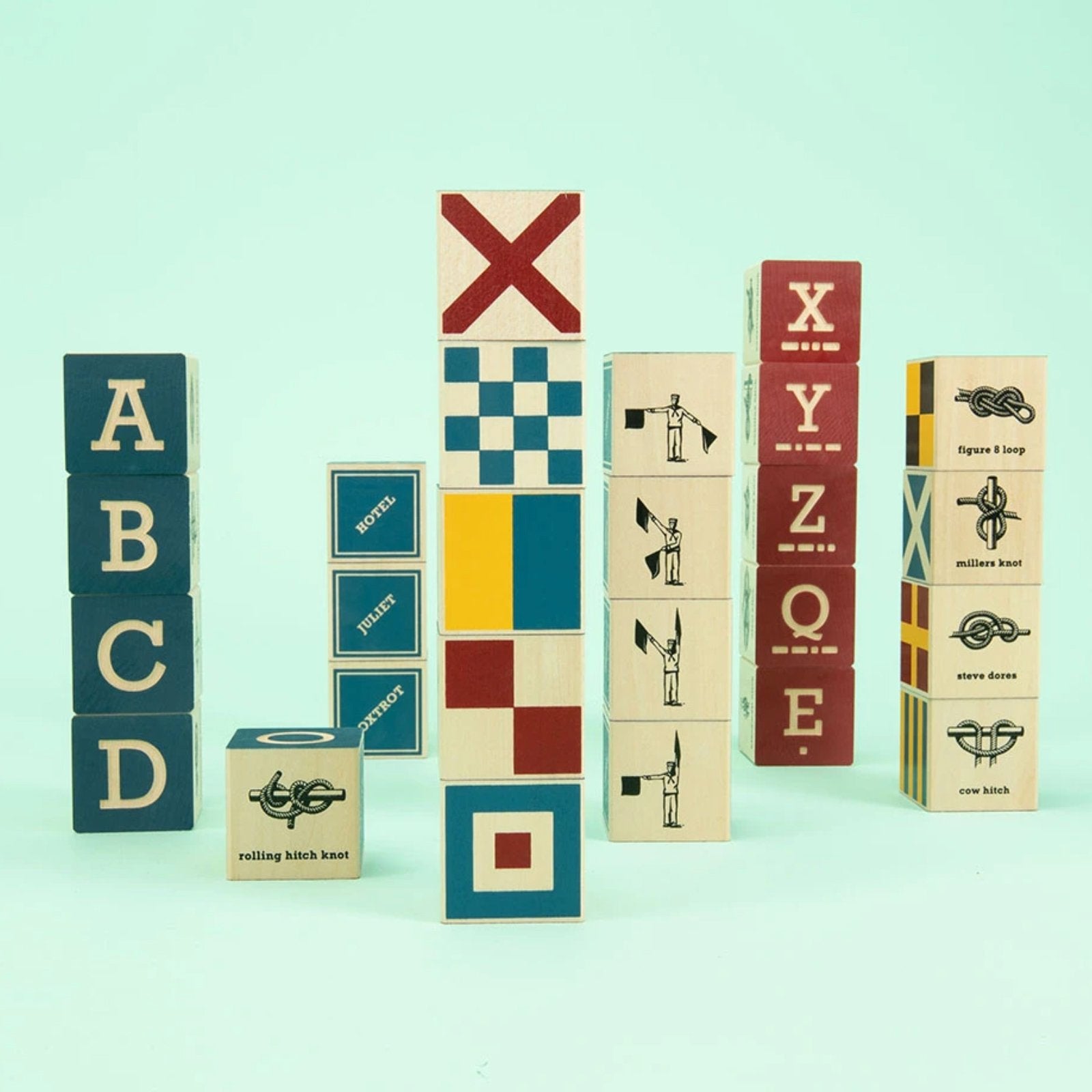 This bold nautical block set features all 26 debossed letters of the alphabet. We decked each block with matching semaphores, NATO phonetics, and Morse codes. Two more sides sport an illustrated knot plus a colorful maritime signal flag.