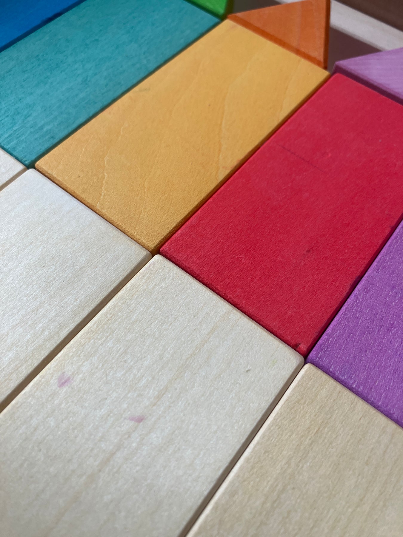 Ocamora Construction Set Natural and rainbow includes: 5 rainbow coloured rectangular prisms, 5 natural rectangular prisms, 5 rainbow coloured cubes, 5 natural cubes, 5 rainbow coloured triangular prisms and a tray