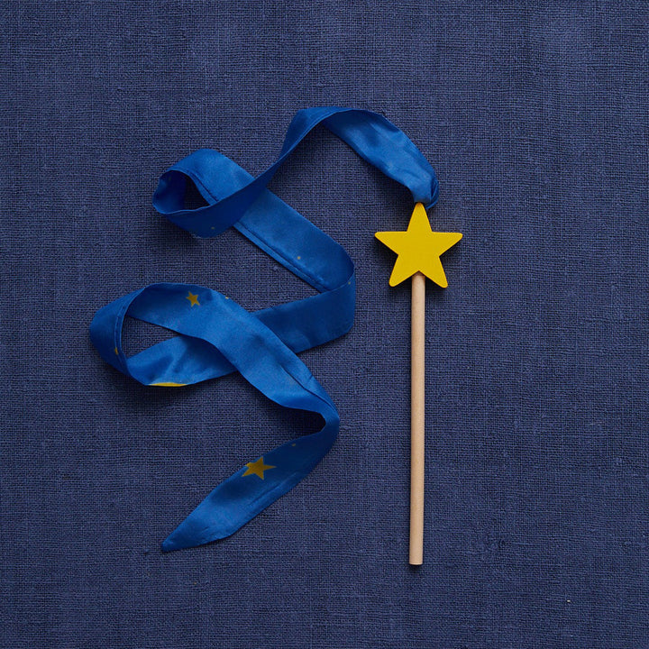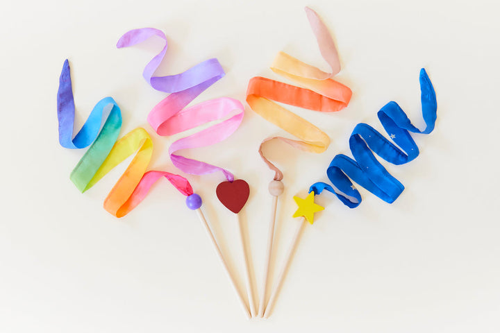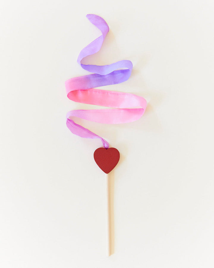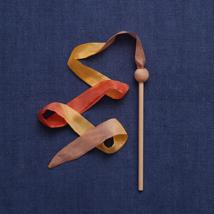 Wooden wand with shimmering silk streamer topped with a decorative wooden bead.