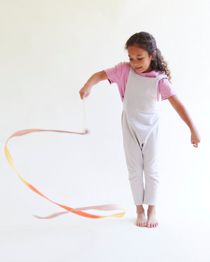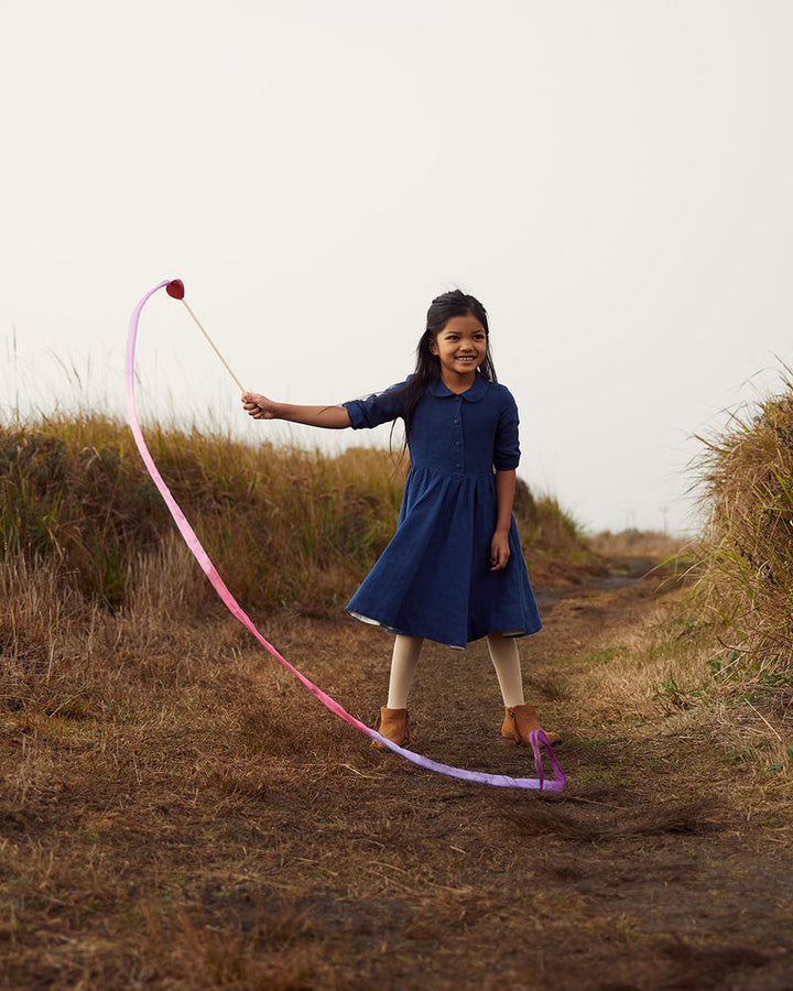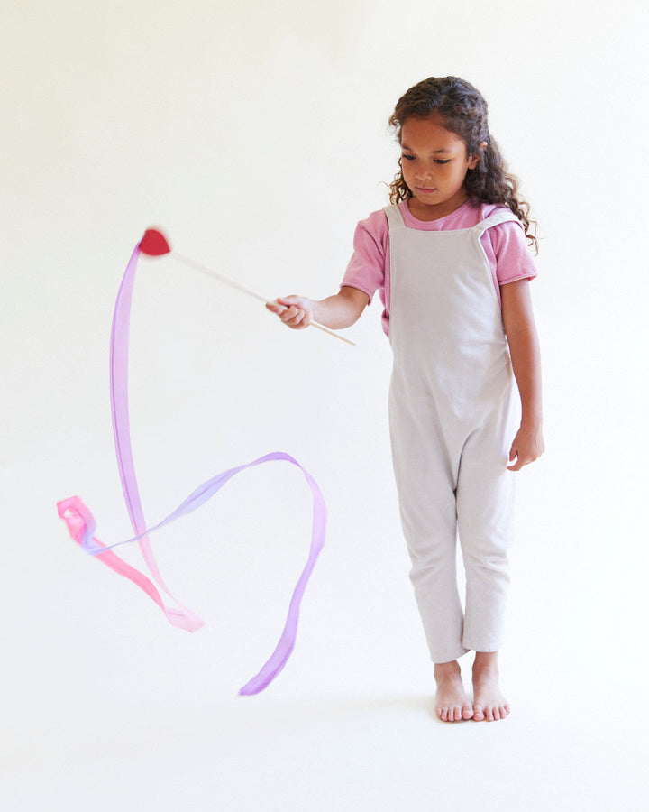 Wooden wand with shimmering silk streamer topped with a decorative wooden bead.