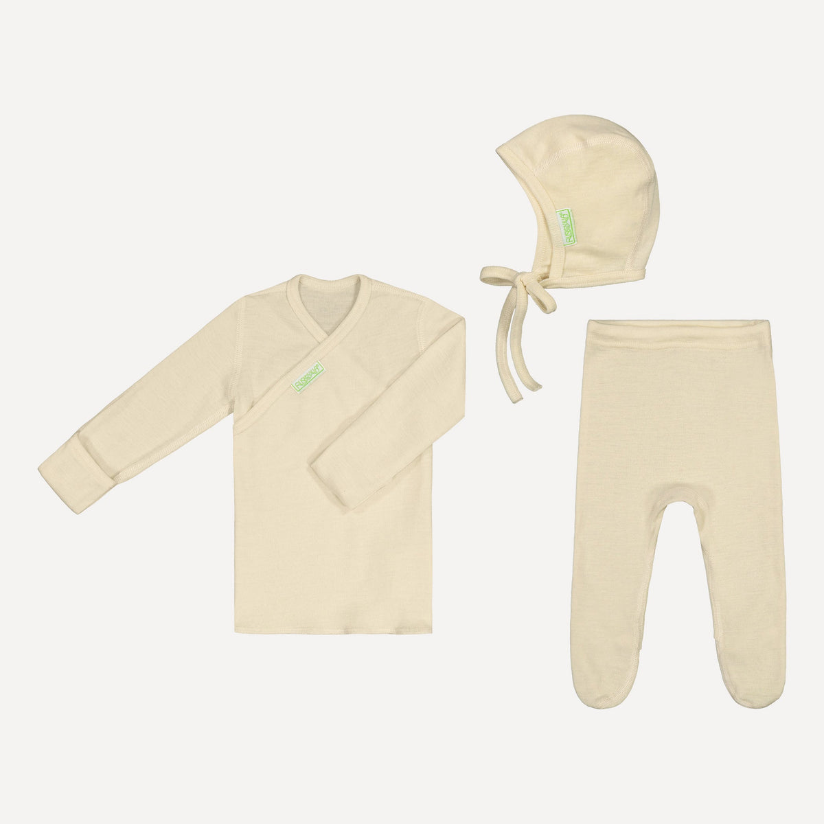 A wonderful gift set in undyed natural off-white silkwool blend for a newborn.