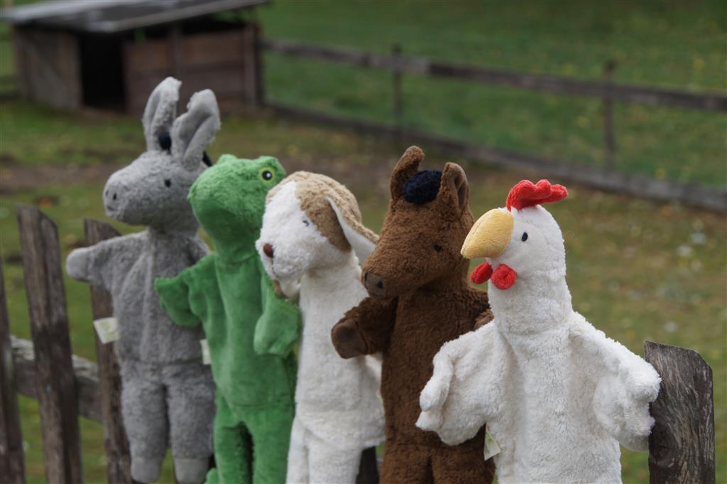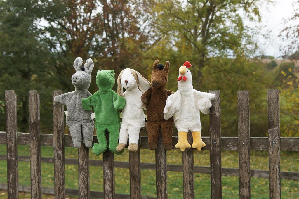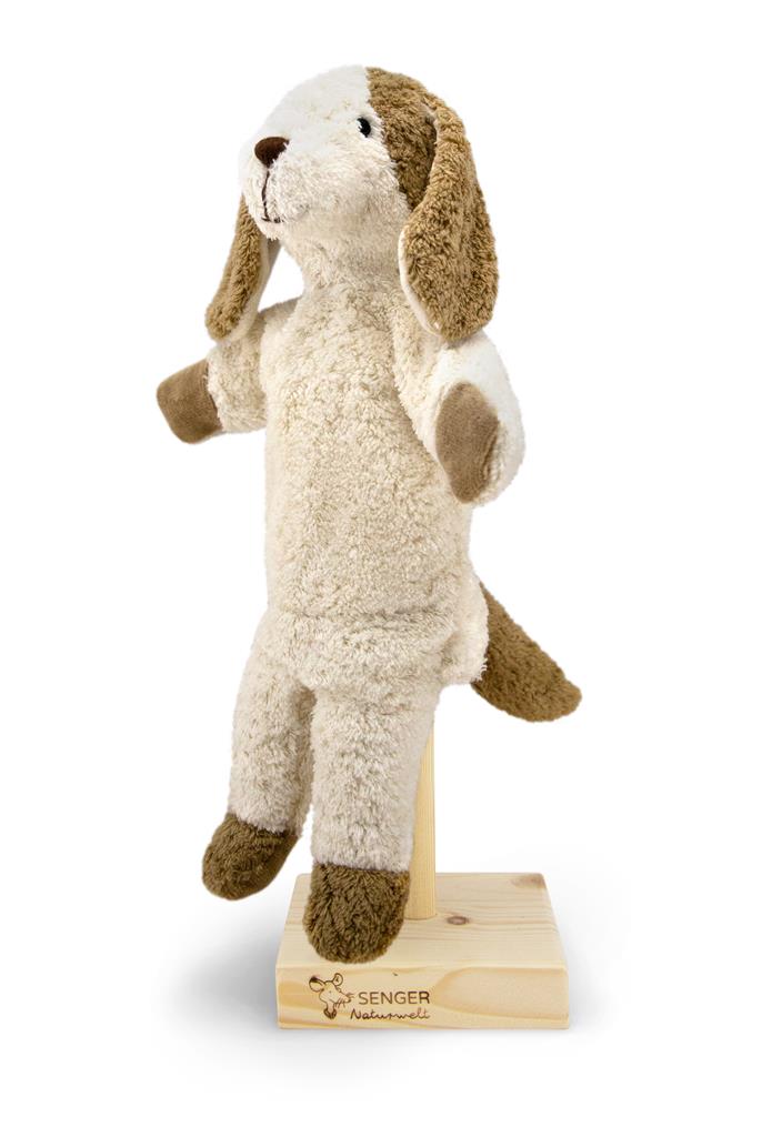 The cuddly soft ~35 cm tall hand puppets made of ecological certified organic cotton plush are hand-made like all animal puppet series by Senger.