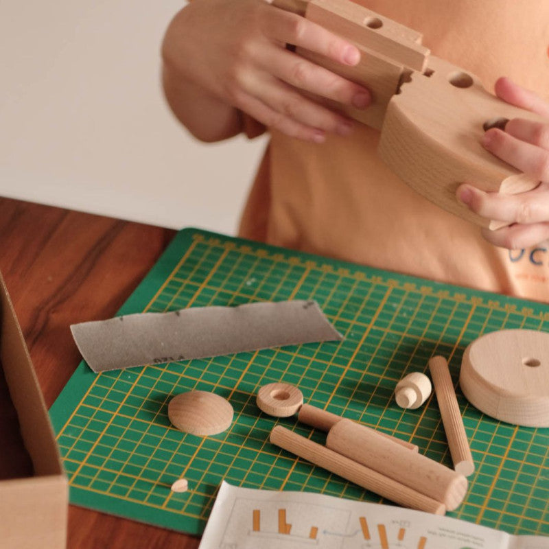 TRAKTOR – MAKE IT! is a wooden construction kit that lets kids assemble the toy step by step. The set includes all parts.