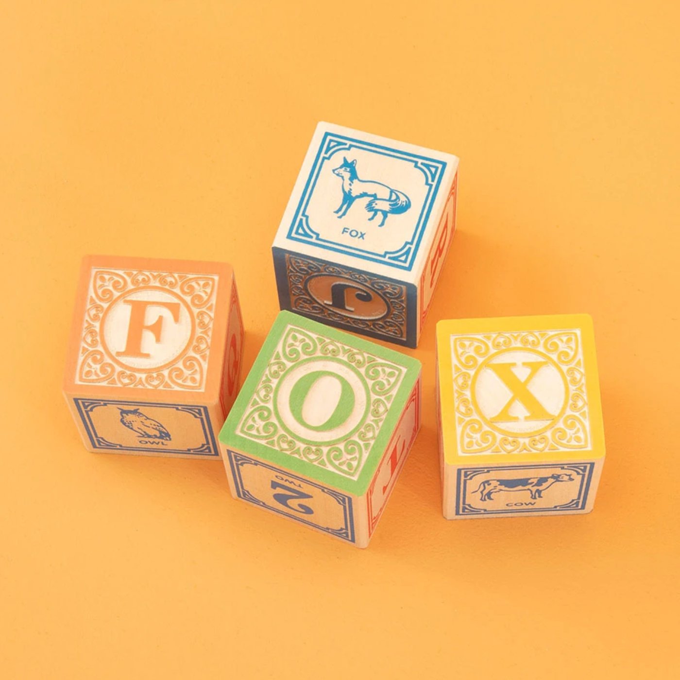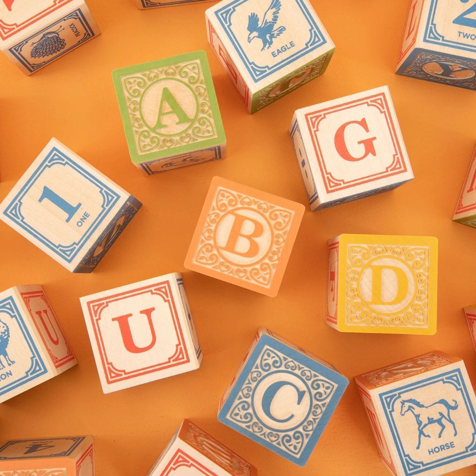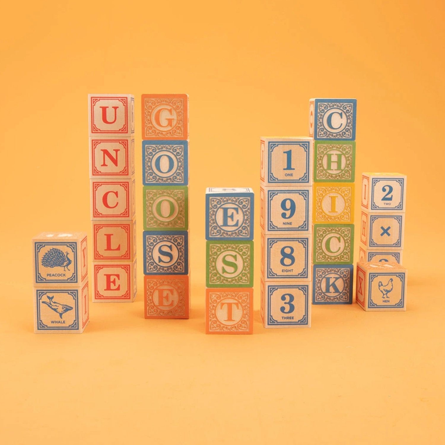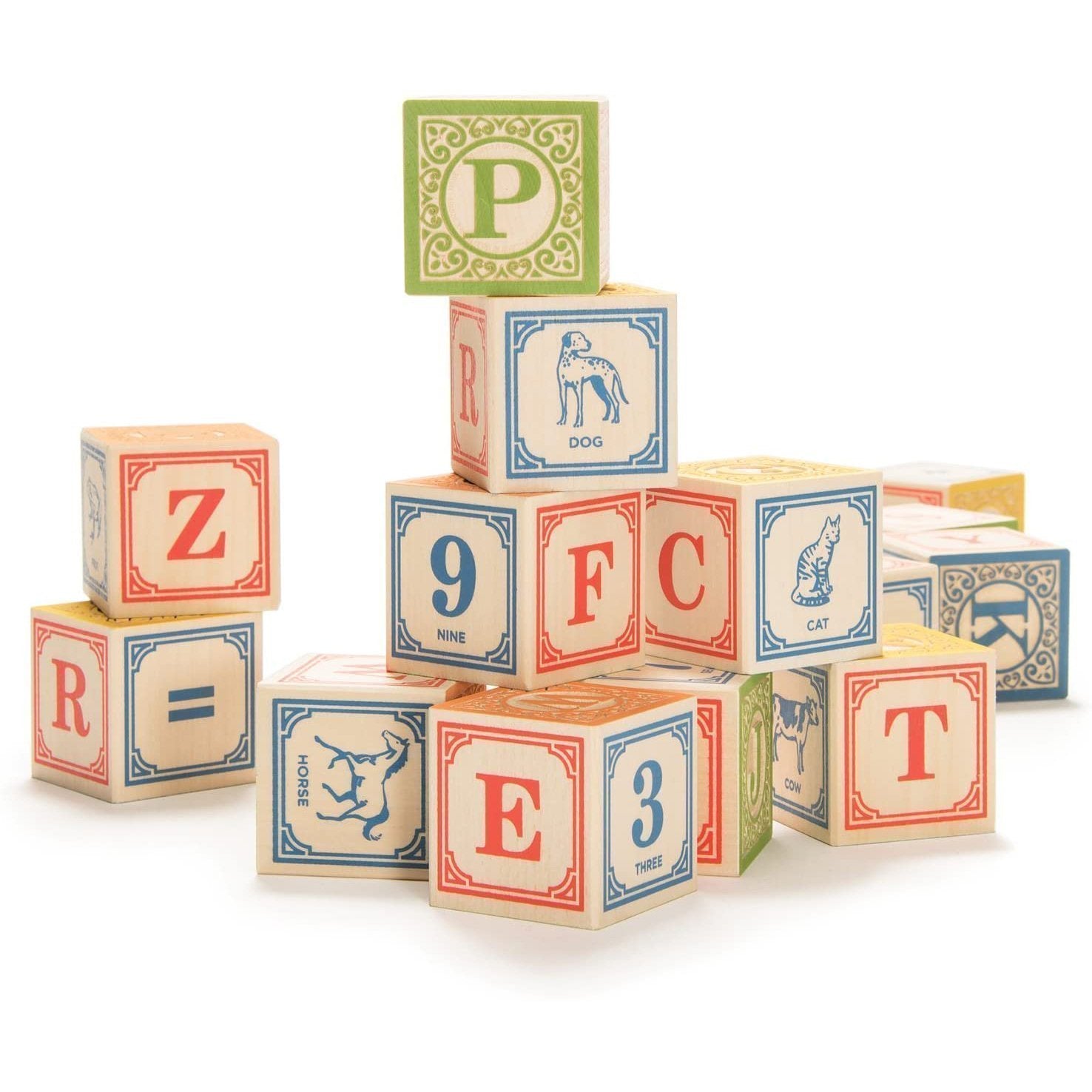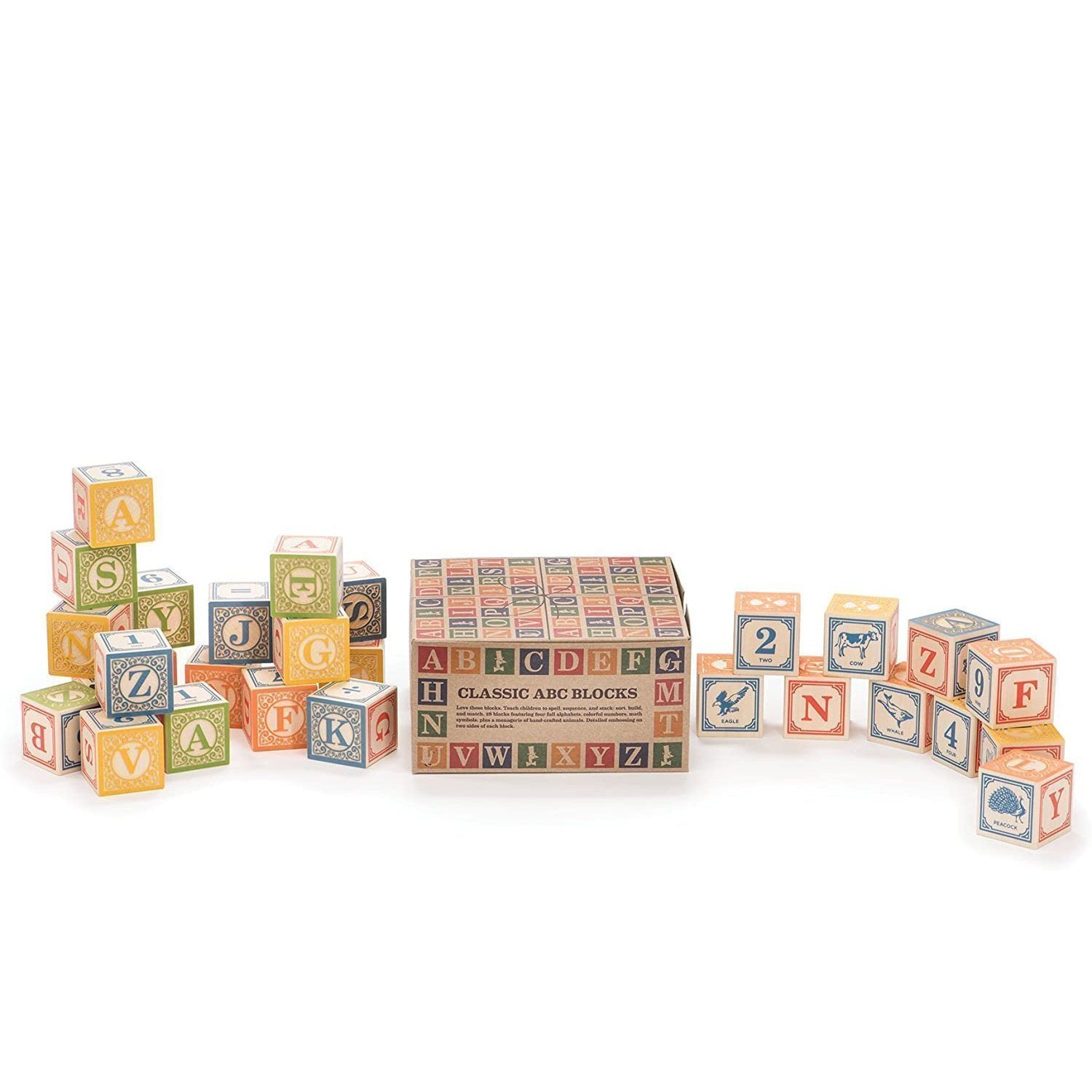 This set of 28 blocks is crafted from sustainable Michigan basswood, then embossed and printed with a colorful range of non-toxic inks. The blocks show a variety of animals, numbers, math symbols, and four full alphabets.