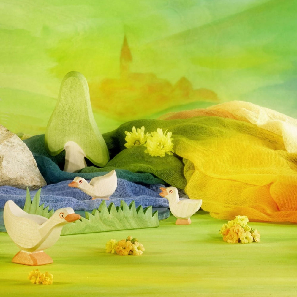 Ostheimer figures are made entirely by hand in Germany. The high quality of environmentally-friendly Ostheimer wooden toys is based on the use of certified materials. The warm, natural material of wood comes from sustainable domestic forestry and certified organic wood, and the selected childsafe colors and organic oils preserve the natural characteristics of the wood and make it tangible for the child. Many senses are thus involved: the grains of the surface of the wood, the smell of high-quality oils, the beautiful sight for the eye. Artistic and practical designing and painting have a focus so that the characteristic peculiarities of an animal's very typical appearance, in short its spirit, are expressed in it. This is so achieved, not in merely the naturalistic depiction that each outer detail creates, but rather the shapes and painting are deliberately limited to essentials; something special from the character and gesture of an animal or a human figure. The child is not getting something finished in the hand, not a detailed snapshot of a trotting horse with defined eyelashes and facial expression - rather, an Ostheimer wooden figure leaves the child completely immersed in the exciting world of "horse" and gives their imagination much space for play, again and again new scenes and situations to make: as the horse is galloping, standing, neighing, nestling their head against me or it lies down to rest. The design of Ostheimer figures can behave in typical fashion in their movement, as they can look at any moment quite different. All that is in the restrained design of the wooden figure in it, and the child can bring it out, imaginative play coming to life.